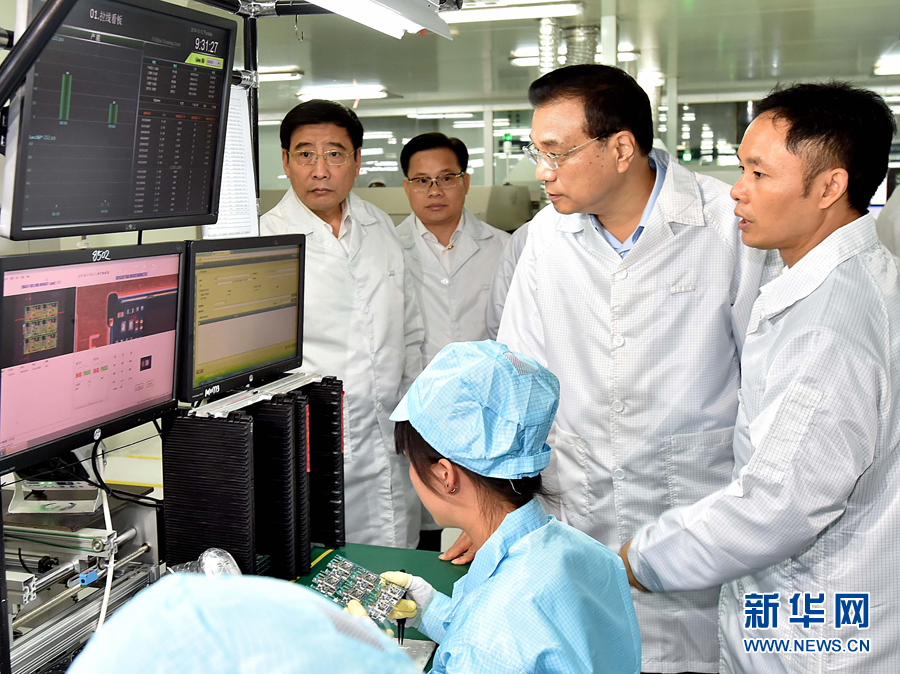 10月12日至13日,中共中央政治局常委、国务院总理李克强在广东深圳、东莞考察,并出席2016年全国大众创业万众创新活动周。这是10月13日,李克强在东莞欧珀数码产品公司听取工作人员汇报企业生产销售情况。 新华社记者 李涛摄
