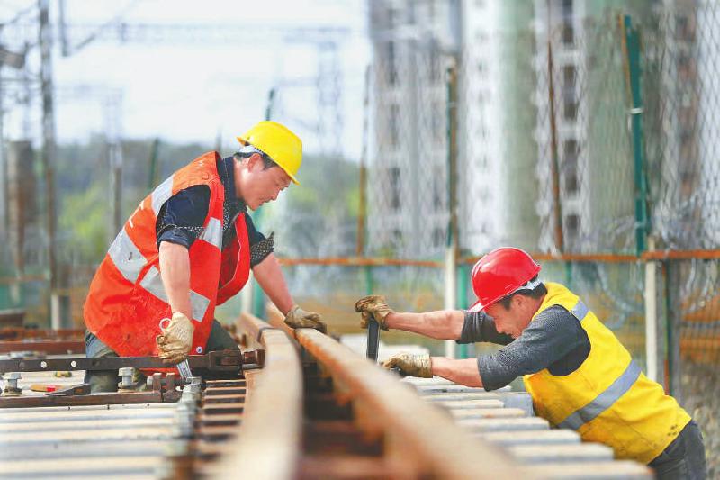 5月11日,遂宁市西部铁路物流园内,铁路建设工人正在为铁路物流园货运专用线接轨国家铁路网络而紧张施工,项目完工后可连接蓉欧快铁、渝新欧铁路。 钟敏 摄(视觉四川)