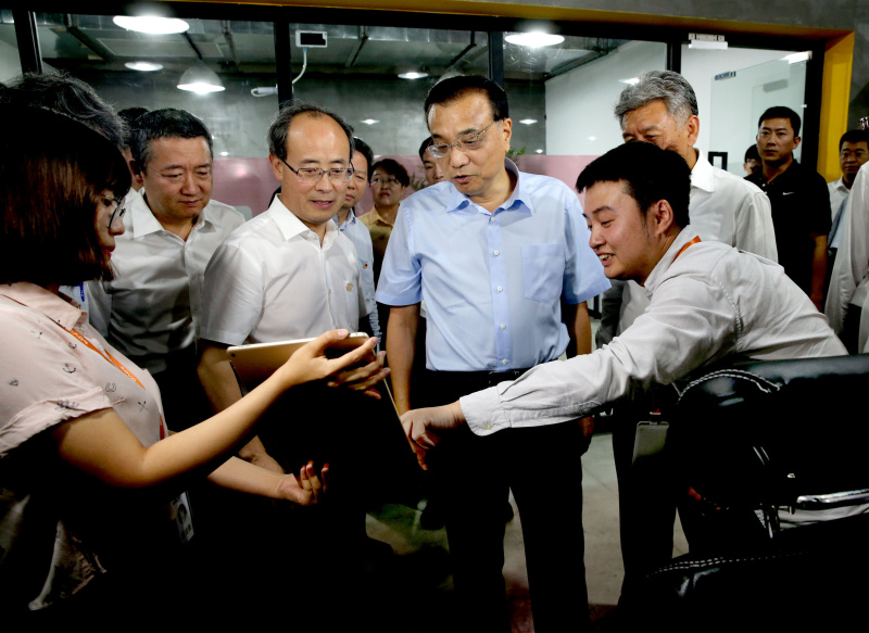 在出席夏季达沃斯论坛期间,中共中央政治局常委、国务院总理李克强在辽宁大连考察。这是6月28日,李克强在大连东软信息学院大学生创业中心参观学生实践项目。