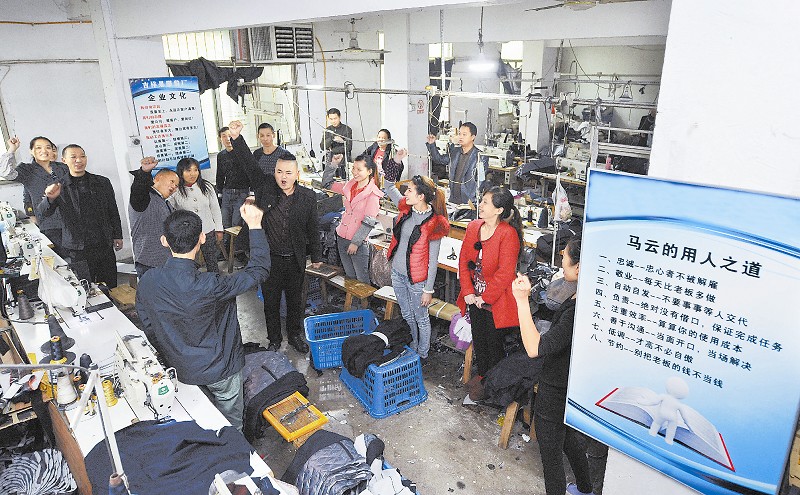 郫县安靖镇土地村的一家服装厂,经营者带领工人一起高喊“雄起”,准备迎战“双11”。