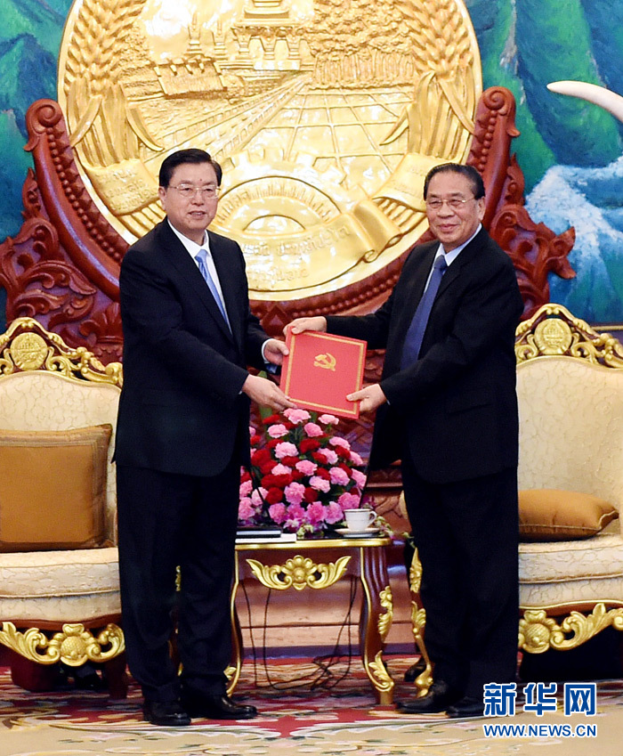 12月1日,中共中央政治局常委、全国人大常委会委员长张德江在万象会见老挝人民革命党中央总书记、国家主席朱马里。这是张德江向朱马里转交习近平总书记的亲署函。新华社记者饶爱民摄