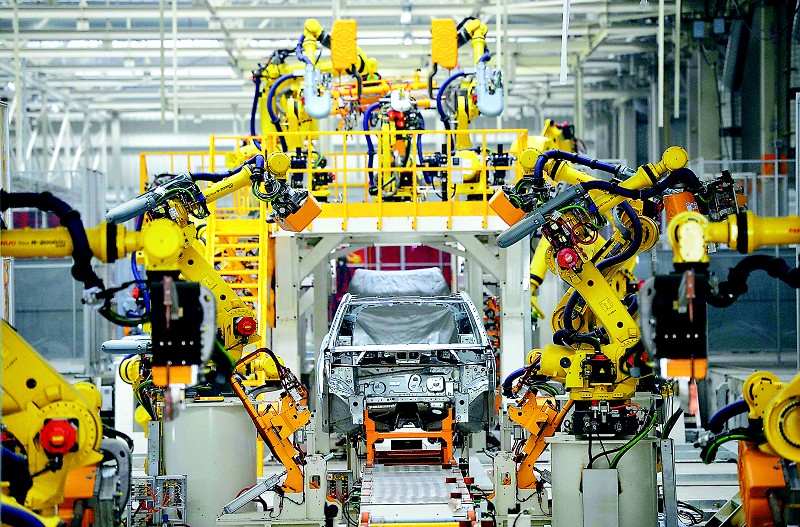 神龙汽车成都工厂,机器人正在生产线上进行焊接作业。
