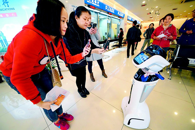 南充市一银行内的机器人“大堂经理”能通过语言交流、触摸交互等方式识别客户需求。