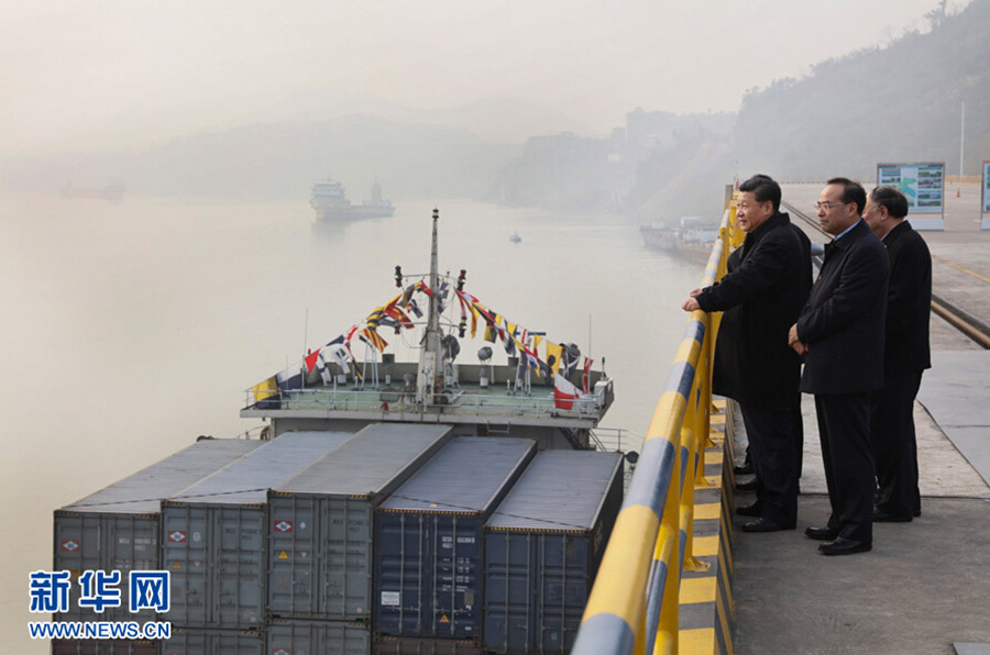 1月4日至6日,中共中央总书记、国家主席、中央军委主席习近平在重庆调研。这是1月4日下午,习近平在重庆两江新区果园港码头视察长江航运和港口装卸作业。新华社记者 兰红光 摄