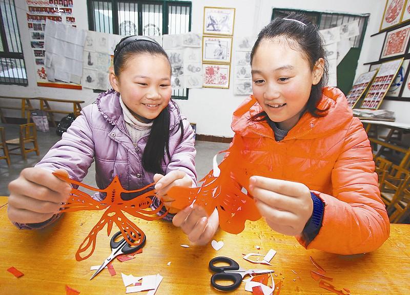 近日,射洪县香山中学初一学生学习手工剪纸。