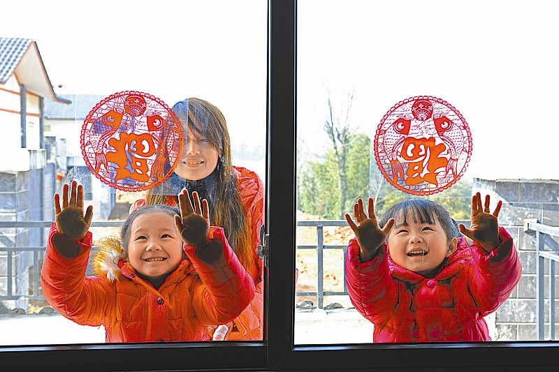 天全县始阳镇乐坝新村的居民过新年贴窗花。雅安市委宣传部供图