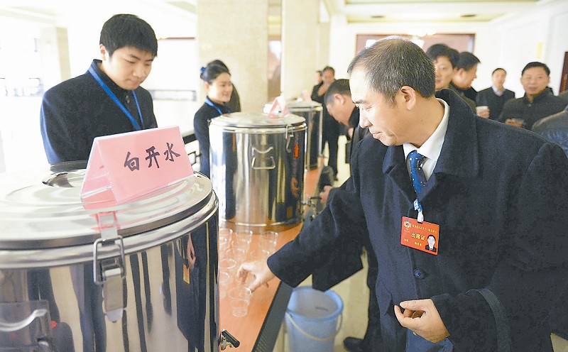 在会场外的服务专区,代表委员们在接白开水。本报记者 李向雨 摄