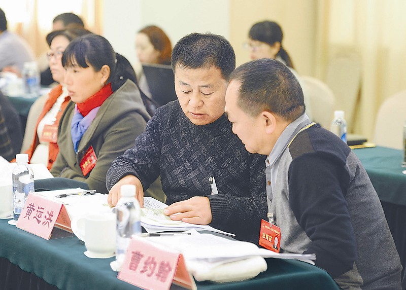 黄运洪代表(右二)与曹约翰代表(右一)讨论政府工作报告中关于交通建设的内容。本报记者 何海洋 摄