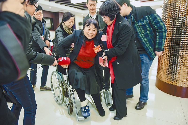 张兴菊代表在会前摔伤了脚踝,但她没有请假,坐着轮椅坚持参会。