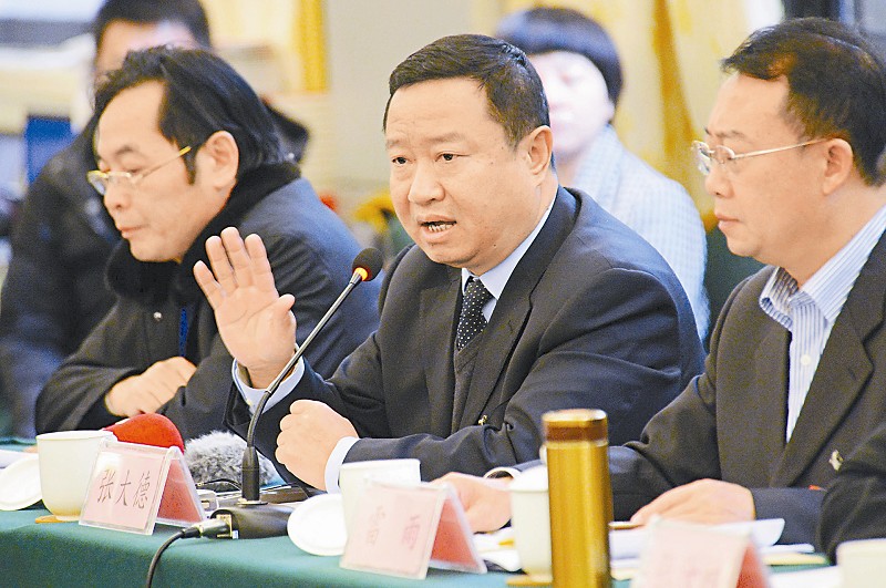 张大德代表(中)建议要整合多种要素,促进川内钢铁企业转方式调结构,实现转型升级。