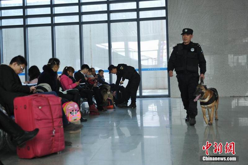 2月4日,春运期间四川乐山警方除设立固定执勤岗位外,特警、武警还携带武器、警犬进行武装巡逻,加强车站、景区等区域的安全保障,让民众过一个欢乐祥和的春节。