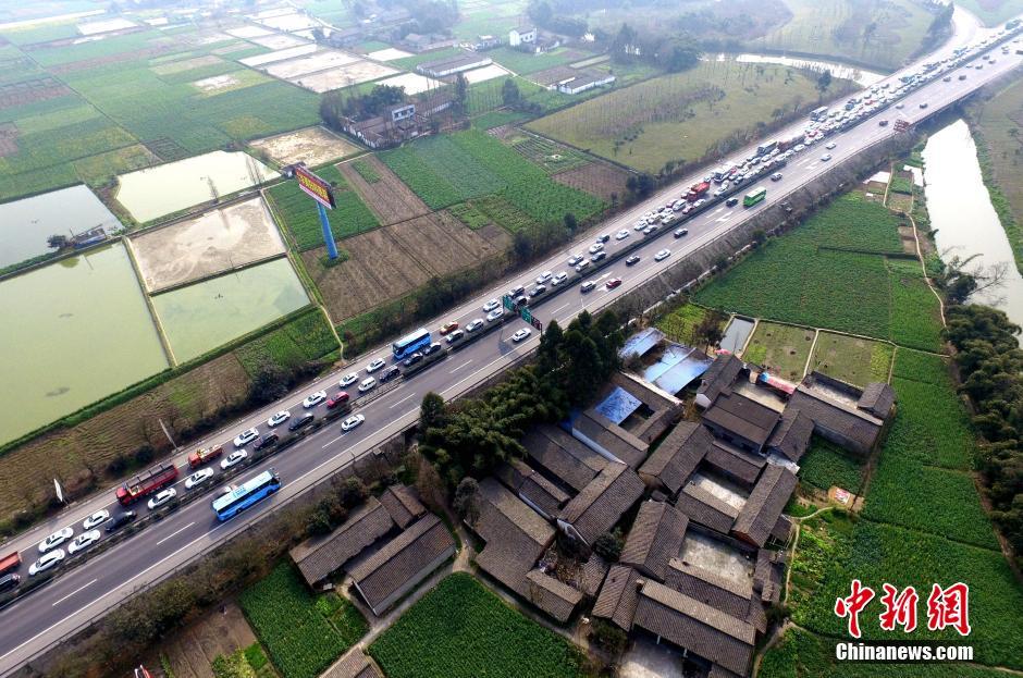 2月12日,成乐高速眉山往成都方向车多道路通行缓慢。当日,是农历正月初五,京昆高速四川广元、绵阳、雅西段,成乐、成巴等多条高速公路迎来春节长假返程高峰,多条高速路因追尾交通事故致道路通行缓慢,高速交警将根据道路情况实施分流。 中新社记者 刘忠俊 摄