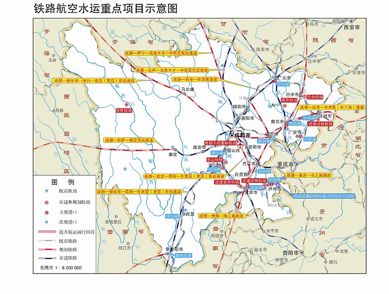 机场。加快建设成都天府国际机场以及乐山、巴中、甘孜、阆中机场,迁建宜宾、泸州、达州机场,改扩建南充、九寨黄龙、广元机场,规划研究广安机场建设和绵阳机场迁建。加快建设自贡凤鸣、绵阳北川等二类及以上通用机场,迁建遂宁通用机场。