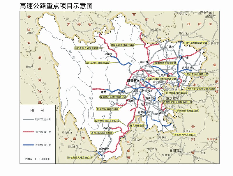 高速公路。建成汶川至马尔康、雅安至康定、成都经济区环线、巴中至桃园、宜宾经古蔺至习水、攀枝花至大理、宜宾至彝良、成都经安岳至重庆、巴中经广安至重庆等高速公路。加快建设绵阳至九寨沟(川甘界)、泸州至荣昌、马尔康至青海久治、天府国际机场高速、仁寿至攀枝花、康定至新都桥高速康定过境段、西昌至昭通、乐山至汉源、成都天府国际机场经资阳至潼南、绵阳经巴中至万源等高速公路,实施成南、成乐、成雅、成彭、泸黄高速扩容改造。