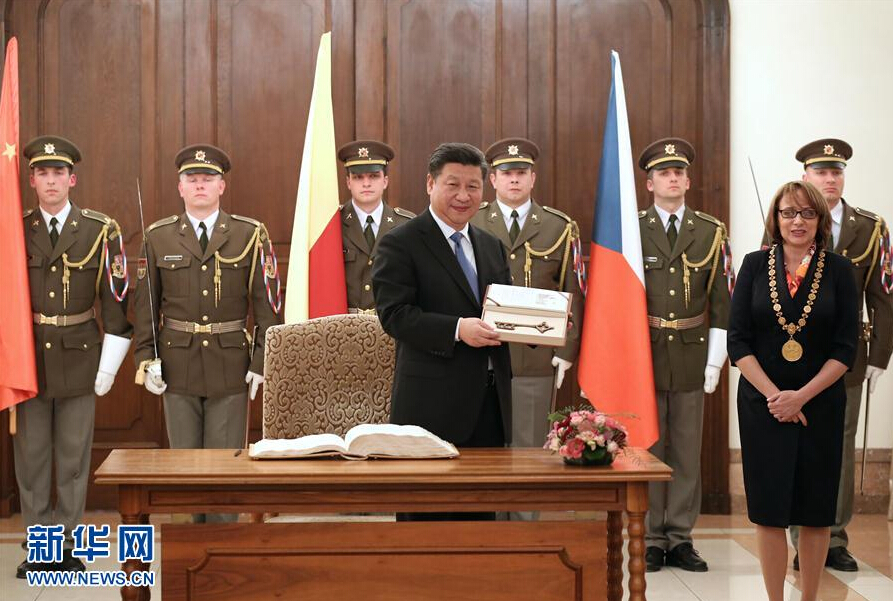 当地时间3月29日,国家主席习近平在捷克布拉格会见布拉格市长科尔娜乔娃,并接受科尔娜乔娃代表该市赠予的城市钥匙。 新华社记者 庞兴雷 摄
