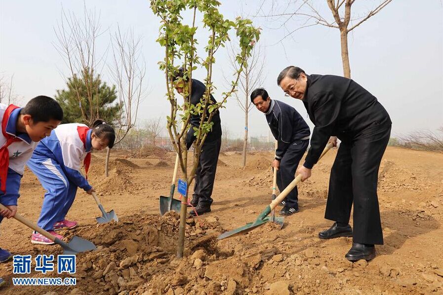 这是俞正声同大家一起植树。新华社记者刘卫兵摄