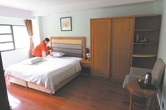 4月12日,在邛崃市夹关镇周河扁新村一家庭酒店,农户在客房里做内务。