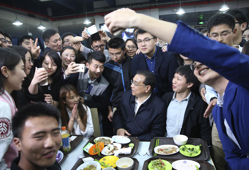 【李克强在北大食堂与学生一起就餐】15日傍晚,当李克强出现在北大农园食堂时,整个大厅气氛顷刻达到沸点,同学们争相上前与总理握手、拍照。李克强端着餐盘选好菜后坐到学生中间。从食堂菜价贵不贵到国家助学金够不够用,从宿舍住宿条件到同学们的论文选题,总理兴致勃勃与大家边吃边聊了半个多小时。