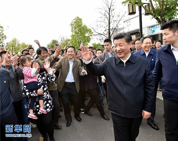 4月24日至27日,中共中央总书记、国家主席、中央军委主席习近平在安徽调研。这是4月25日下午,习近平在滁州市凤阳县小岗村向村民们问好。 新华社记者李涛摄