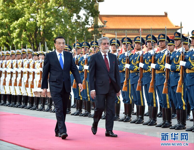 5月16日,国务院总理李克强在北京人民大会堂同来华进行正式访问的阿富汗首席执行官阿卜杜拉举行会谈。这是会谈前,李克强在人民大会堂东门外广场为阿卜杜拉举行欢迎仪式。新华社记者李涛摄