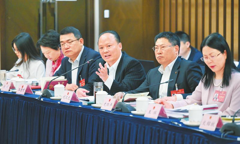 3月7日,十四届全国人大二次会议四川代表团在驻地举行小组会议,全国人大代表、通威集团董事局主席刘汉元(右三)建议,稳定可再生能源补贴政策,促进行业健康可持续发展。 四川日报全媒体记者 欧阳杰 摄