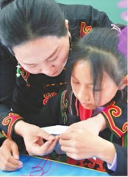 全国人大代表、乐山市马边彝族自治县花间刺绣专业合作社负责人乔进双梅正在教授学生彝绣技艺。 牛萍 摄