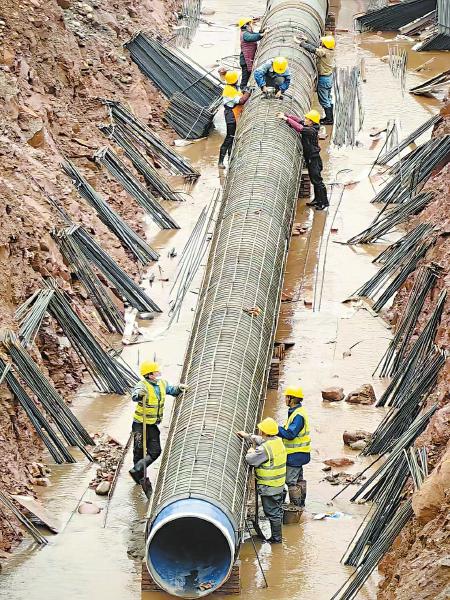 乐山市夹江县城乡供水一张网项目工地,工人在铺设青衣江过江管网。 张稳 摄