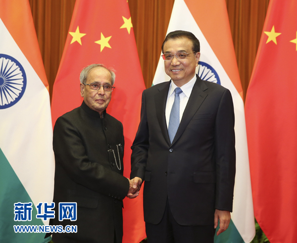 5月26日,国务院总理李克强在北京人民大会堂会见来华进行国事访问的印度总统慕克吉。 新华社记者 丁林 摄
