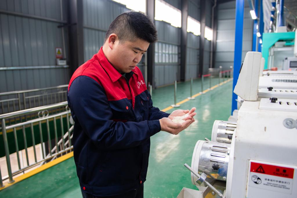 2022年2月22日,在湖南省常德市鼎城区谢家铺镇亿泽生态农业科技有限公司生产车间,陈帅宇在抽查生产过程中大米的品质。新华社记者 周勉 摄