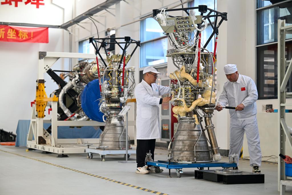 2024年3月11日,在安徽九州云箭航天技术有限公司生产基地,技术人员对即将交付的液体火箭发动机进行最后的检查。 新华社发(黄洋洋摄)