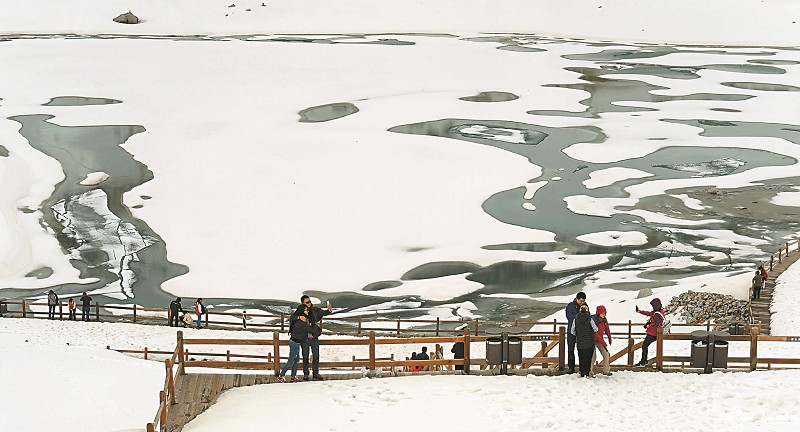 在黑水县达古冰山风景名胜区,众多游客在冰山下避暑纳凉。 本报记者 李向雨 摄