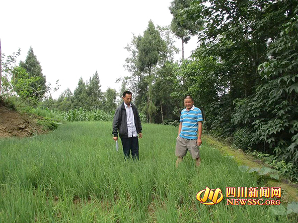 王尔鹏(右)了解陈勇家的香葱生长情况