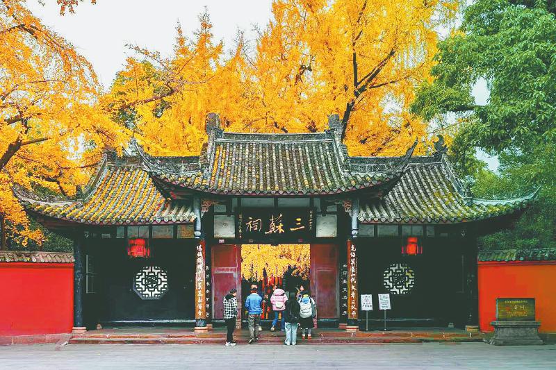 三苏祠南大门两棵古老的银杏树,不仅见证着千年的历史变迁,也承载着三苏文化的深厚底蕴。12月7日,以“银杏映三苏 文韵画卷长”为主题的2024年三苏祠银杏季活动启幕,吸引了众多游客前来赏“杏”品文。