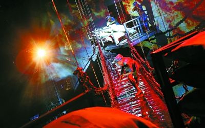 “飞夺泸定桥”是长征中最重要的战役之一。“大渡桥横铁索寒”,舞台上,一座5米高的铁索桥悬空架起,几根粗铁链并排,搭成不足一米宽的桥板,在空中摇摇晃晃。站在铁索上往下看,直让人两腿发软,而20几个舞蹈队员就要在这几根铁索上,一个接一个地奔袭过去。