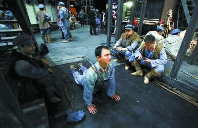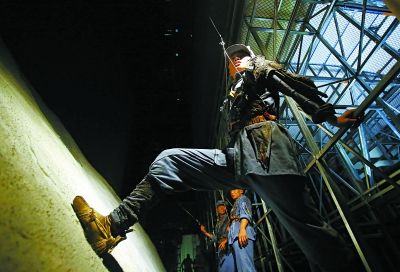 “能不害怕嘛!铁索是软的,还会晃。”上场口边,舞蹈队员张雄雄和杨彩峰怀抱“步枪”准备着。除了奔跑,他们还要在摇晃的铁索上表演中弹、侧倒等受伤动作。“恐高就自己克服,多跑几次就好了。”张雄雄憨厚地一笑。