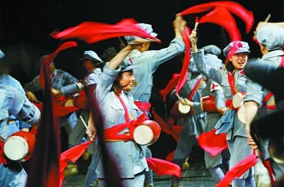 ▼红军胜利会师会宁,演员们如临其境,打起腰鼓,飞舞绸带,舞台上欢天喜地。