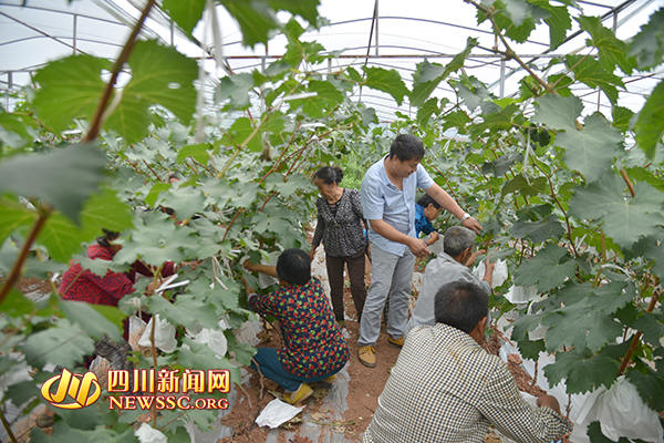 花包村村民在葡萄园打工,给葡萄套上带子。(图片由恩阳区委宣传部提供)