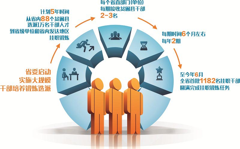 2015年12月,按照集中力量打赢扶贫开发攻坚战、确保同步全面建成小康社会的安排部署,省委启动实施大规模的干部培养锻炼选派,计划5年时间从省内88个贫困县选派1万名干部人才到省级单位和省内发达地区挂职锻炼,每个省直部门(单位)每期接收贫困县干部2-3名,每期时间6个月左右,每年2期。至今年6月,全省首批1182名挂职干部圆满完成挂职锻炼任务。