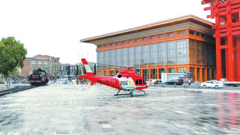 四川沃飞长空科技发展有限公司直升机提前到达旅博馆外。乐山市文化广播电视和旅游局供图