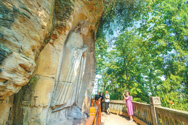 随着四川省唯一的石窟数字展示中心开启游客承载量压力测试,安岳石刻游玩路线受到更多游客喜爱。图为游客在安岳县茗山寺参观游览。 资阳观察 吴昊江 摄