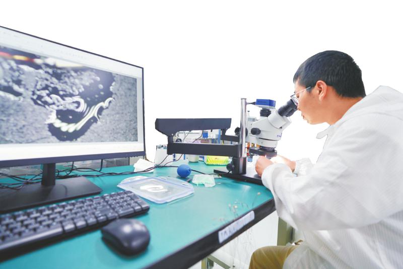 绵阳科技城光子技术研究院技术人员通过显微镜加工某元器件。绵阳观察 郭超英 摄