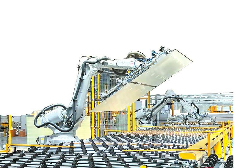 凯盛(自贡)新能源有限公司太阳能材料生产车间内,机械手正将一张张光伏玻璃从输送辊道上取下。 自贡市沿滩区委宣传部供图
