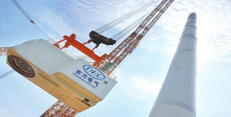 8月29日,由东方电气集团完全自主研制的全球最大26兆瓦级海上风电机组,在东营风电装备测试认证创新基地成功吊装。 东方风电供图