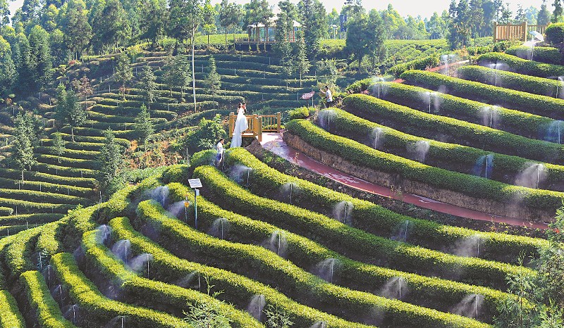 一台台自动喷灌器喷出细细的水雾,在清晨的阳光下交织出一道道彩虹;沐浴在水雾的滋养中,牛碾坪万亩生态茶园一棵棵茶树青翠欲滴。“真是太美了!”“这样的美景多的是。”同行的雅安市副市长、市公安局局长谢忠华说,从这里出发,有一条长达14公里的骑游绿道,处处美不胜收。“绿变金”,如今,牛碾坪及周边的5.1万亩茶园,让当地群众人均增收2300元。骑游绿道边上曾经的贫困村,早已脱贫。
