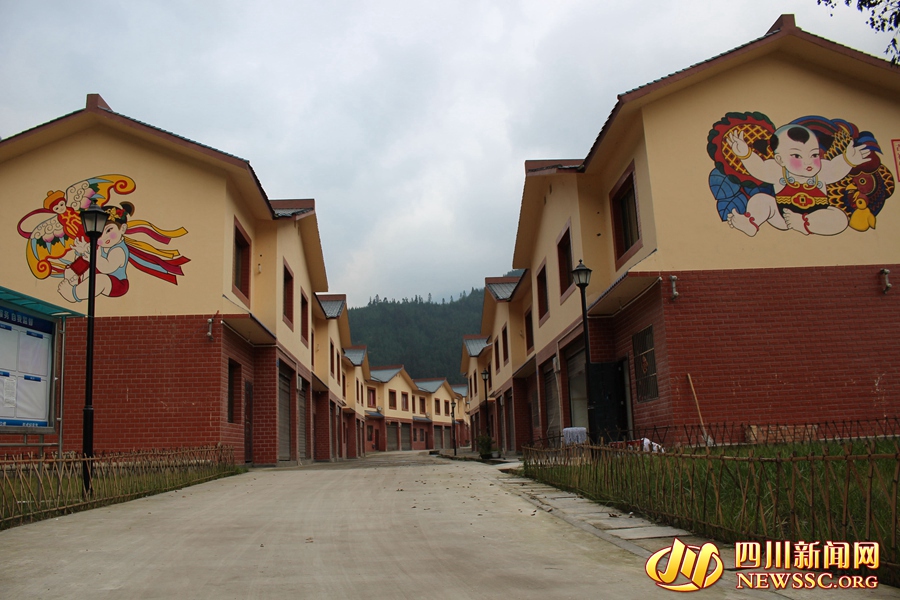 2016年7月15日,四川新闻网记者来到钟灵村,映入眼帘的,是震后新建的钟灵村新村聚居点。环抱在青山绿水间,映衬在蓝天白云下的钟灵村新村聚居点,蓝色的瓦、淡黄色的墙,在冬日暖阳下显得格外的靓丽耀眼。两排房屋弯曲而下,房前的河堤、房后的公路环绕着一栋栋新房,景观堰从中穿过。