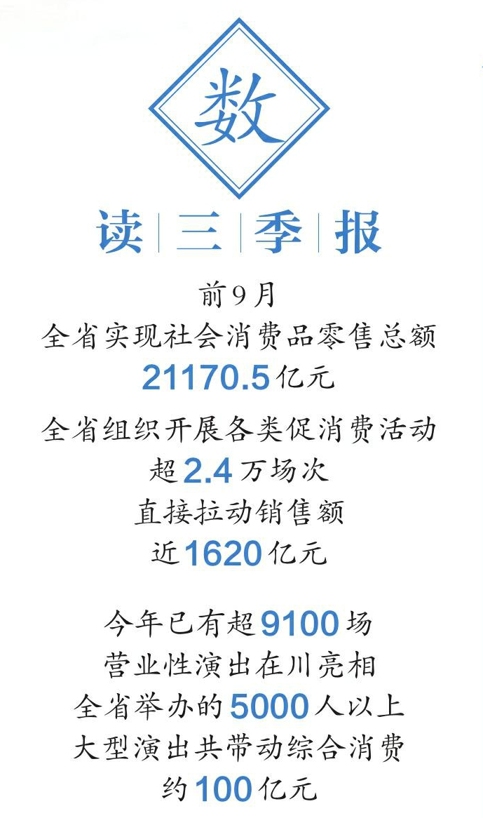新型消费活力涌现。一大批国内外演艺明星、赛事名人扎堆到四川办活动、搞比赛。今年以来,已有超过9100场营业性演出在四川亮相。前9月,全省举办的5000人以上大型演出共带动交通、住宿、餐饮等综合消费约100亿元,拉动效应明显。