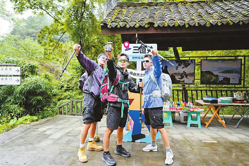 在近日举办的光雾山徒步挑战赛中,三名游客在指定打卡点合影。