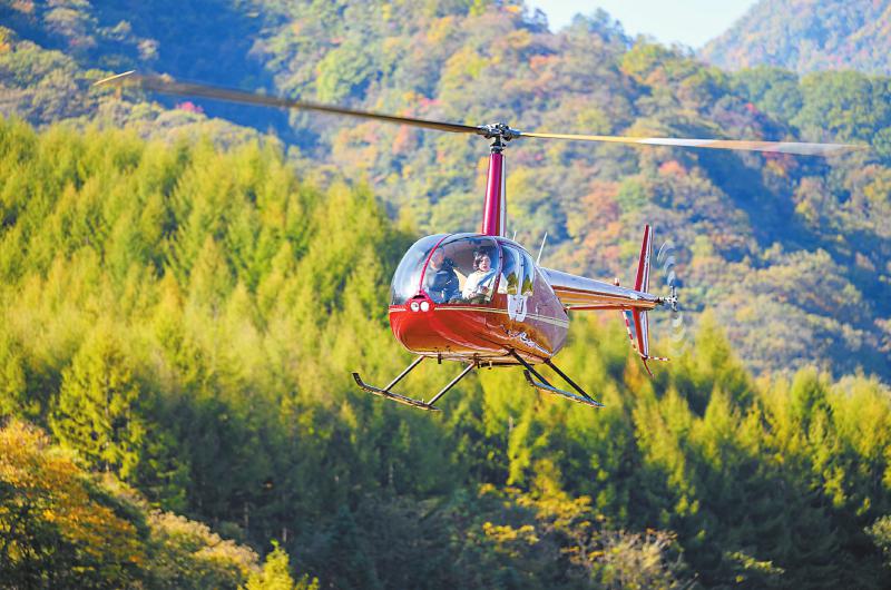 近日,游客乘坐直升机俯瞰米仓山旅游景区红叶。