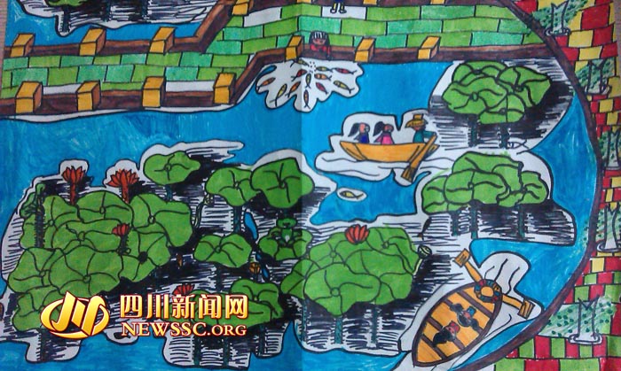 为提高全民环保生态意识,增强全民绿色发展理念,倡导全川人民加入到共建共享绿色美丽四川的行动中来,7月26日,四川新闻网“童画绿色四川”大型新媒体行动正式启动,全川的小朋友们纷纷拿起画笔,画出他们自己眼中看到的绿色美丽家乡。今天,我们收到了一幅名为《美丽的富顺西湖》的画,自贡市富顺县华英实验学校四年级4班的宋雨珂小朋友用手中的画笔画出了自己心目中富顺西湖的美景。宋雨珂小朋说:“西湖的湖面碧波荡漾,波光粼粼。七月的西湖荷花早已绽放,一个个莲蓬频频点头象小朋友们挥舞着小手,荷叶在晨风中随风起舞,露珠象坐着摇篮在荷叶上摇来摇去……”