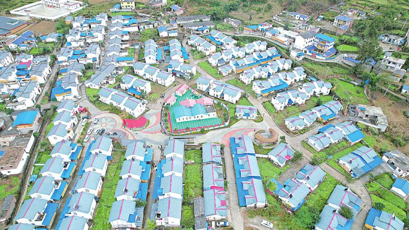 近年来,绵竹市扎实推进对口帮扶工作,在甘洛县普昌镇眉山村持续推进村景观廊道、核心广场等休闲设施建设,通过开展年画上墙、美丽庭院等项目,集中打造“民族美学村”。图为绵竹市投资打造的甘洛县最大的易地搬迁安置点普昌镇眉山村。绵竹市对口帮扶甘洛县前线指挥部供图